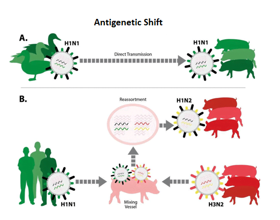 In 2009 is er door deze reassortment een nieuw griepvirus ontstaan dat zich over de gehele wereld verspreidde (=pandemisch) bij zowel mensen als varkens. Dit virus kennen we als “Mexicaanse griep” of “Varkensgriep”. Deze namen kloppen eigenlijk niet, want het virus is zeer waarschijnlijk in Canada ontstaan en heeft weliswaar varkensgenen, maar daarnaast ook genen van watervogels en mensen. Dit virus was volledig anders dan de stammen die tot dan toe voorkwamen. Daardoor was er geen goede afweer aanwezig en kon het virus zich wereldwijd verspreiden in mensen én varkens. Door dit laatste kunnen varkens dus mensen besmetten (zoönose), maar dit kan ook omgekeerd.